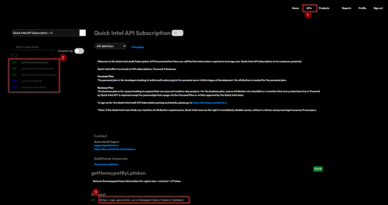 Head over to the Quick Intel Developer Portal at <https://developer.quickintel.io/apis>